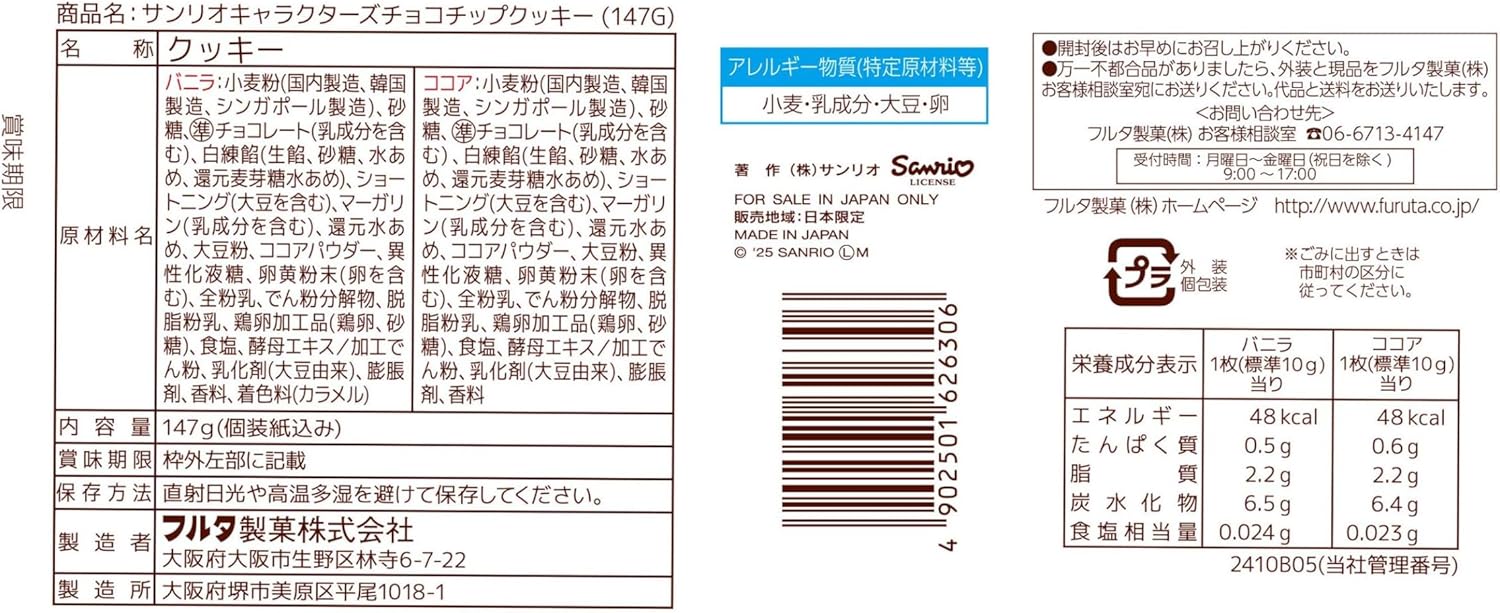 Add some cuteness to your snack time with Sanrio Characters Chocolate Chip Cookies by Furuta. 🍪💖 Each crunchy cookie is dotted with sweet chocolate chips and packed in an adorable Sanrio-themed mini pack featuring fan-favorite characters like Hello Kitty, My Melody, and Cinnamoroll. Perfect for portioned snacking, lunchboxes, or sharing with friends—delicious cookies wrapped in kawaii charm!