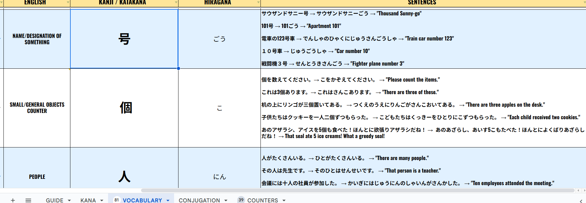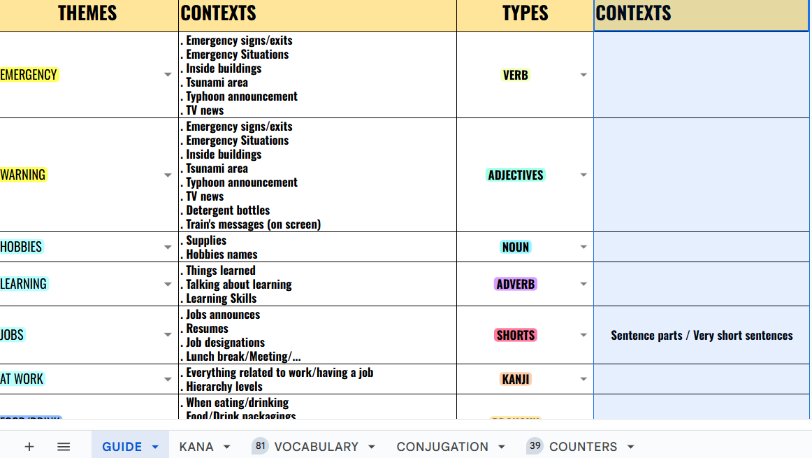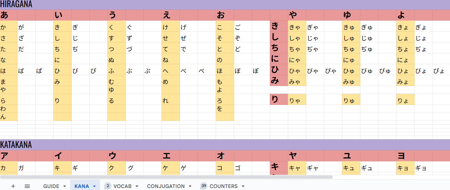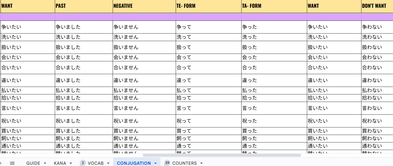 The sheet is cleanly structured and easy to navigate, with multiple tabs covering vocabulary, conjugations, counters, and kana—so you can jump straight into learning without setup stress.