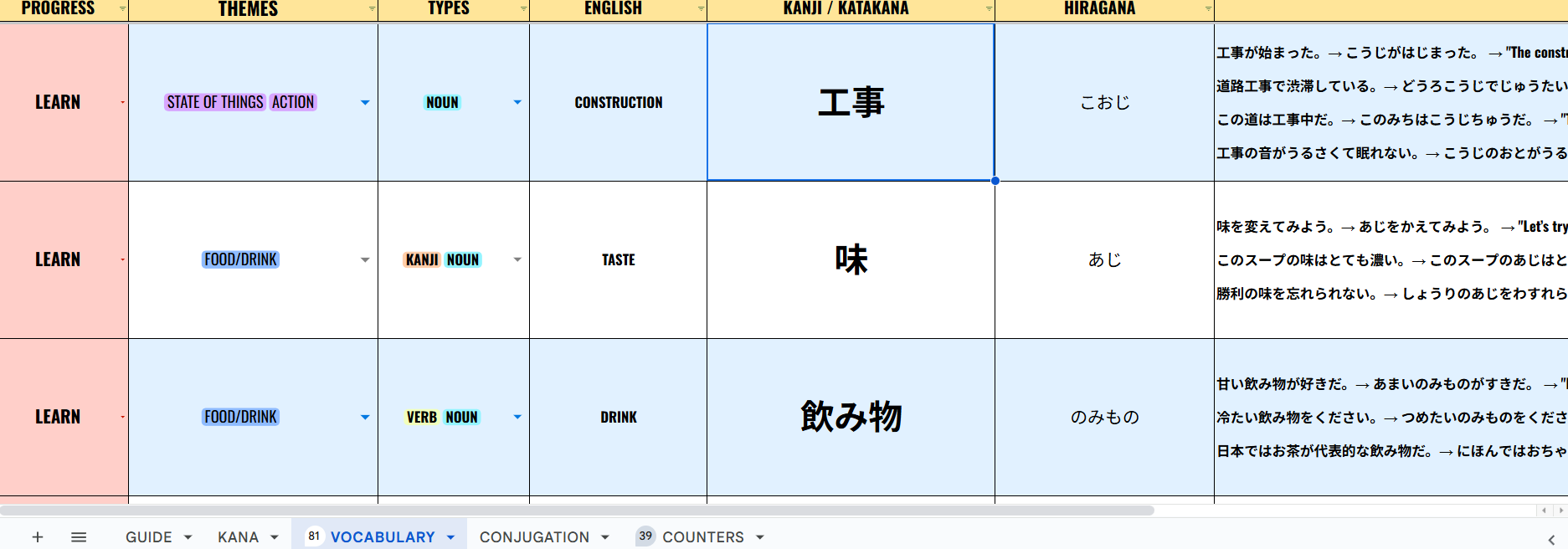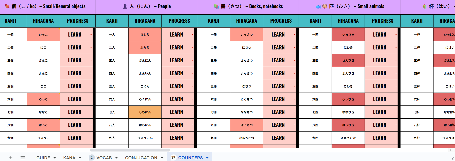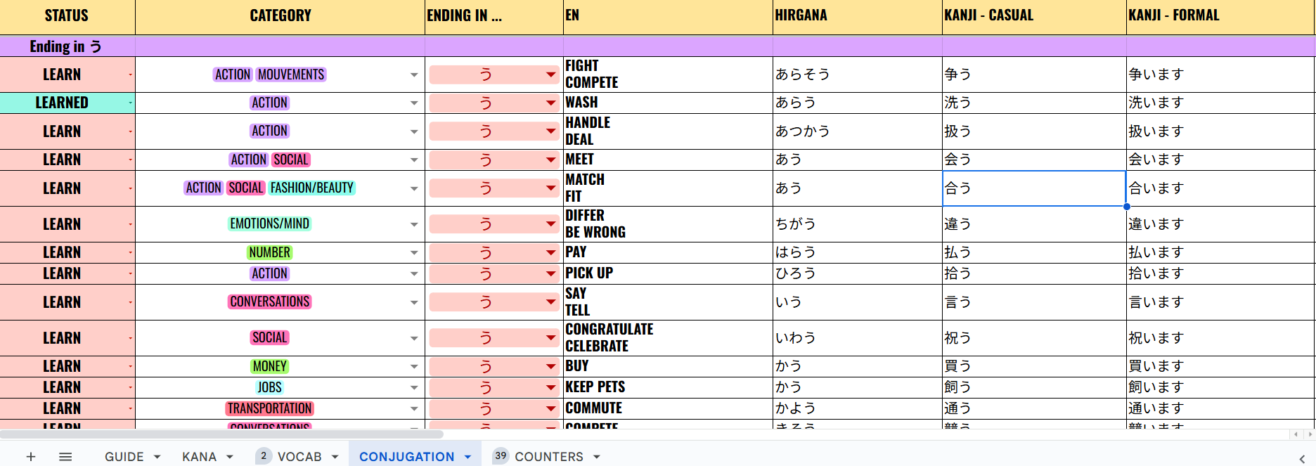 The sheet is cleanly structured and easy to navigate, with multiple tabs covering vocabulary, conjugations, counters, and kana—so you can jump straight into learning without setup stress.