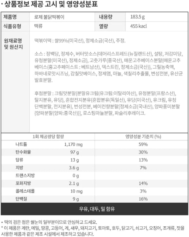 Tteokbokki rice cake: 99% rice (imported), refined salt, citric acid, alcohol. / Buldak Tteokbokki Sauce: Refined sugar, purified water, red pepper paste {glutinous rice mixed seasoning (glutinous rice flour: from China), corn syrup, mixed seasoning (red pepper powder: from China), wheat flour, powdered mixed seasoning}, corn syrup, grill concentrate [grill concentrate base {rich flavor base (reaction base (composite soy sauce powder (defatted soybean: from India)))}, boiled base (refined salt: from Korea), dextrin, wheat starch, yeast extract], monosodium L-glutamate (flavor enhancer), Samyang soy sauce {amino acid soy sauce (defatted soybean: from India), growth (defatted soybean: from India)}, modified starch, chicken flavor powder, garlic, flavor base S, spicy seasoning red pepper powder, refined salt, onion, habanero flavor seasoning, Jimmy's beef broth powder, red pepper powder, Yeast extract, flavor enhancer, paprika extract, chicken curry flavor base, black pepper powder, chili extract, lactic acid bacteria fermentation powder